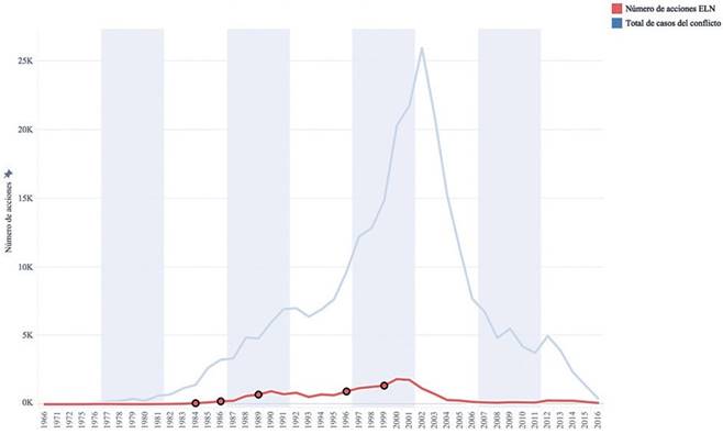 En general, la periodización de las acciones del ELN evidencia que su estrategia de internacionalización impactó su dinámica de acción. Como se expuso, la llegada de la Mannessmann a Colombia (1984) es el punto de inflexión, especialmente en términos financieros, para la consolidación del ELN como actor del conflicto; asimismo, los ascensos y descensos de la década de los noventa están relacionados con la mesa de negociación y, por tanto, con la estrategia de internacionalización hacia Europa.