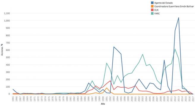 Sin embargo, a partir del Gobierno Pastrana el ELN se ve obligado a replegarse por el accionar paramilitar y de las fuerzas estatales, lo que redujo el número de acciones bélicas iniciadas hasta niveles comparables a los de sus dos primeras décadas de existencia; a partir de este momento, quien mantiene el protagonismo armado es la guerrilla de las FARC. Asimismo, la figura 6 evidencia que, si bien los últimos años han presentado un repunte en la confrontación, este no llega a ser comparable al nivel de acciones de confrontación iniciadas en la década de los noventa. En general, se mantiene integrado a la dinámica del conflicto, con un grado de protagonismo armado hasta finales de los noventa, cuando se empieza a diluir su impacto en la dinámica, sin lograr todavía recuperarse.