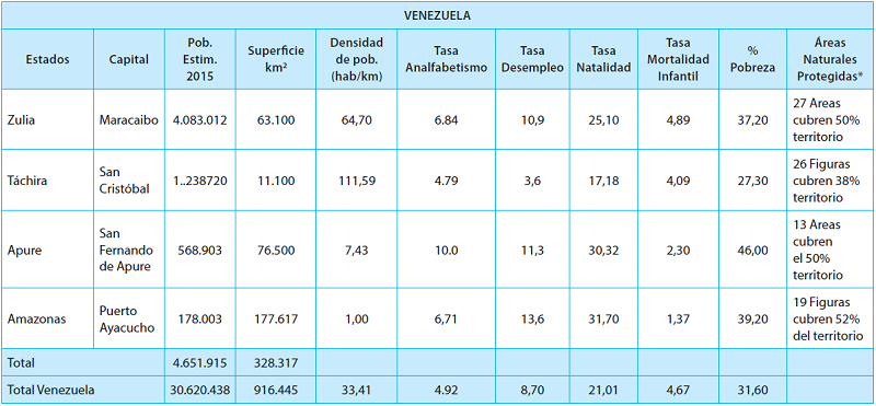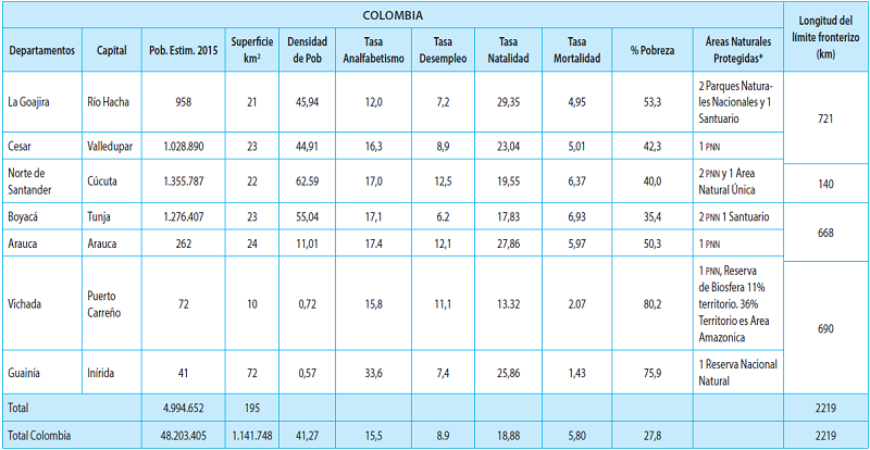 Geográficamente este espacio está conformado por siete departamentos de Colombia (La Guajira, Cesar, Norte de Santander, Boyacá, Arauca, Vichada y Guainía), que representan el 25 % del territorio, y 4 estados de Venezuela (Zulia, Táchira, Apure y Amazonas), que equivalen al 36 % del territorio nacional. Estos espacios fronterizos reúnen una población casi proporcional a cada lado, estimada para el 2015 en unos 10 millones de habitantes (ver tabla).