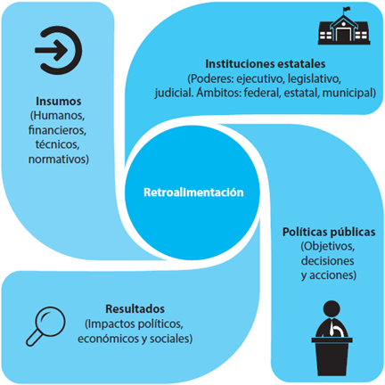 Como se aprecia, las instituciones del Estado se encuentran organizadas bajo principios constitucionales determinados, que se materializan en un conjunto de organizaciones (secretarías, direcciones generales, empresas paraestatales, juzgados, escuelas, hospitales, entre otros), que disponen y combinan determinados recursos (normativos, humanos, financieros y tecnológicos) y los traducen en políticas, programas y servicios públicos con el propósito de lograr determinados resultados que pueden ir desde la atención de problemas sociales, hasta el control de sus comportamientos y la satisfacción de demandas que redunden en ciertos impactos favorables que pueden ser de naturaleza política, social o económica.