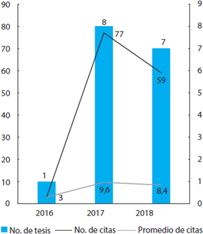 Los resultados del análisis realizado para el caso de las tesis de la maestría en Gobierno y Políticas Públicas coinciden con la conclusión de Roth (2016b), al evidenciarse un uso del texto caracterizado por una orientación racionalista, enfocado en el estudio de la implementación de políticas en distintos niveles territoriales. Entre 2015 y 2018 se identificó un total de 50 tesis de grado en el programa de maestría en Gobierno y Políticas Públicas de la Universidad Externado de Colombia. En el 32 % de estas (16) el Manual fue citado al menos una vez, el número total de citas en este grupo de trabajos de grado fue de 139, para un promedio de 8,69 citas por texto (figura 1). El número máximo de citas en un texto es de 28 y el mínimo es una cita.
