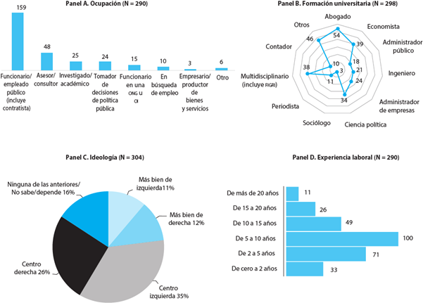 Otras ocupaciones destacadas fueron también asesor/consultor (17%), investigador/académico (9%), tomador de decisiones de política pública (8 %), funcionario de una organización no gubernamental o internacional (5%), empresario o productor de bienes y servicios (1 %). Un 3% de los encuestados se encontraban en búsqueda de empleo y un 2% ejercía alguna otra profesión (figura 10, panel A).