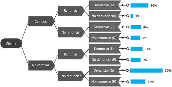 A partir del anterior escenario, la pregunta para los estudiantes es: ¿usted, como analista de política pública y asesor del director, qué haría? (Ordóñez-Matamoros et al., 2013, p. 90). La figura 11 muestra las distintas combinaciones de opciones y las respuestas de los estudiantes del curso: cambiar o no cambiar, renunciar o no renunciar y denunciar o no denunciar el caso.