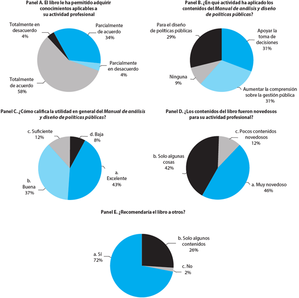 Las encuestas aplicadas evidencian que los públicos a los que se enseña sobre políticas públicas atribuyen la dificultad para solucionar problemas públicos a la falta de voluntad política. Estos manifestaron que su principal interés para formarse en políticas públicas tiene que ver con la transformación del statu quo, hacer las cosas correctamente en su organización/institución y adquirir conocimientos para desempeñarse como asesor/consultor. El perfil de este público se caracteriza principalmente por ejercer como funcionario o empleado público con experiencia de 5 a 10 años; tener formación profesional en derecho, economía, ciencia política u otras áreas multi-disciplinarias; e identificarse con ideologías de centro. En cuanto a las consideraciones éticas y subjetivas de los analistas, se encontró que estos no sacrificarían la veracidad de los hechos para favorecer a su institución, no renunciarían cuando se encuentren en una situación en la que se les pida alterar los hechos en un informe y denunciarían dicho evento. El Manual tuvo un importante impacto para los encuestados en tanto se identificó un importante grado de satisfacción frente al texto, el cual los lectores encontraron aplicable a su entorno profesional, además de útil y novedoso. Sin embargo, existen retos en la adaptación de algunos de sus contenidos a la práctica, y en la ampliación y profundización en algunos de estos.