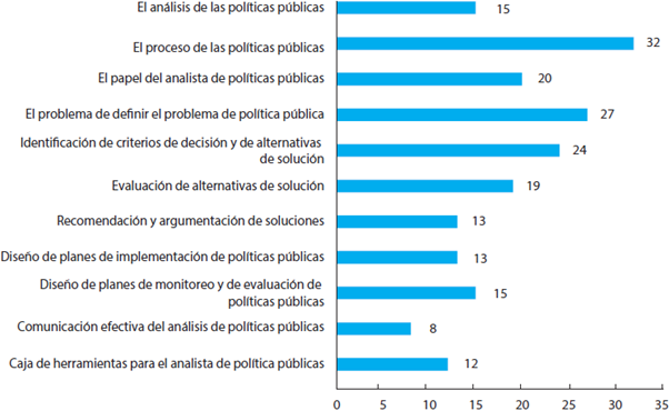 La evolución en la enseñanza de las políticas públicas ha sido abordada como un proceso de institucionalización2 paralelo al de disciplinas como la ciencia política y la administración pública, con un avance hacia la autonomía con respecto de estas dos (Roth, 2016a). Para el caso de Latinoamérica, esta institucionalización ha estado marcada por distintos avances y desafíos en cada país3. En Brasil, el desarrollo de la enseñanza de las políticas públicas se ha favorecido de los incentivos gubernamentales para expandir el sistema educativo, la existencia de una demanda de cursos sobre políticas públicas y el surgimiento de movimientos y comunidades discursivas sobre asuntos públicos (Farah, 2016; Gomes, Almeida y Lucio, 2016). Sin embargo, se resalta que hace falta una formación mucho más focalizada en políticas públicas y reconocimiento de estas por parte de las autoridades como un campo de estudio autónomo (Farah, 2016; Gomes, Almeida y Lucio, 2016).