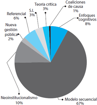 El texto fue citado principalmente en tesis cuyo enfoque teórico es el modelo secuencial (67 %), seguido del neoinstitucionalismo (10 %), los enfoques cognitivos (8 %) y, particularmente, el marco del referencial de política (6 %). Un 3 % de las citas fueron realizadas en textos marcados por la teoría crítica, 2 % por la nueva gestión pública y 1 % por el marco de coaliciones de causa (figura 2). Esto denota que el texto, a pesar de ser enfático respecto al carácter iterativo del proceso de las políticas públicas, es utilizado principalmente para apoyar investigaciones de corte racional-secuencial.