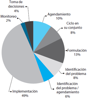 Asimismo, la mayoría de citas se realizaban en tesis enfocadas en la fase de implementación de políticas públicas (48 %), seguido de la fase de formulación (13%), agendamiento (9 %), identificación del problema (8 %), toma de decisiones (4%) y monitoreo (2%). Cabe destacar que el 6 % de las citas se encontraron en textos que analizaban las fases de identificación del problema y de agendamiento en conjunto, un 2% de las citas fueron realizadas en documentos que no especificaban alguna fase de la política pública como énfasis y un 8 % de las citas estaban en trabajos que analizaban el ciclo de la política pública en su conjunto (figura 3).