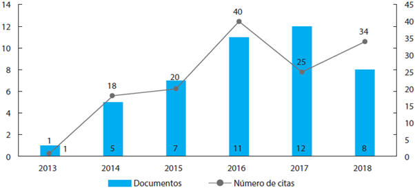 En cuanto a la revisión adelantada para el caso de otros documentos disponibles en plataformas académicas virtuales, se encontraron 44 documentos que citan el Manual en 138 ocasiones, para un promedio de 3,14 citas por documento. Como muestra la figura 5, la citación del texto creció de manera importante desde su publicación al día de hoy, alcanzando su máximo de citas en el 2016 (40) y el máximo de documentos que citan el libro en 2017 (12).