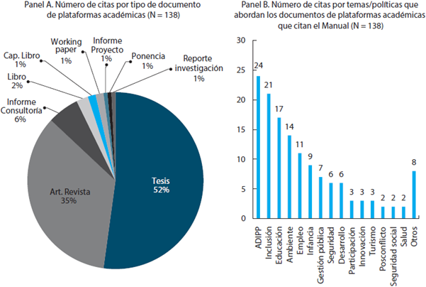 De modo complementario, se adelantó una revisión de otros documentos que citaron el texto para ampliar el alcance de la evidencia. La búsqueda de estos se realizó en las plataformas ResearchGate© y Google Scholar©, en donde se identificaron 44 documentos que citaron el texto en 138 ocasiones entre los años 2013 y 20185. Para el caso de estos documentos se identificó, además del número de citas del Manual, el tipo de texto de que se trata y el tema o la política que aborda. Para ambos grupos de documentos, tanto las tesis de maestría como aquellos de otras plataformas, se identificó qué contenido del texto de Ordóñez-Matamoros et al. (2013) fue citado.