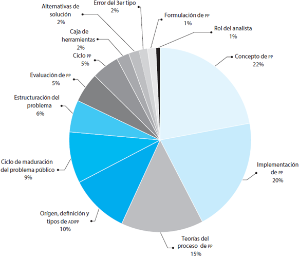 Finalmente, para ambos grupos de documentos, tanto las tesis de la maestría como aquellos identificados en otras plataformas, se identificó qué contenido del Manual citaron (figura 7). La definición de política pública propuesta por el libro es el contenido más citado dentro de los 60 documentos revisados (22 %). Esto evidencia que uno de los principales aspectos relevantes, útiles y de impacto del libro es la definición operacional y original que se proporciona de política pública, construida a partir de tres criterios de tipo material, orgánico y procedimental, referenciada en la sección 3 del presente artículo. En segundo lugar aparece lo relacionado con implementación (20 %), lo cual es ampliamente discutido en el octavo capítulo del libro. Posteriormente, los contenidos más citados son los relativos a las teorías del proceso de las políticas públicas (15 %), al origen, definición y tipos de análisis de políticas públicas (10 %) y al ciclo de maduración de los problemas públicos (9 %).