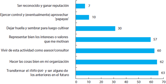Estos otros roles tienen que ver con dejar huella y "sembrar para luego cultivar" (30), es decir, trabajar en la actualidad con miras a obtener beneficios futuros; ejercer control y (eventualmente) aprovechar "papayas" (10), es decir, sacar provecho de situaciones que se presenten a partir del control a otros actores; y, por último, ser reconocido y ganar reputación (7) (figura 9).