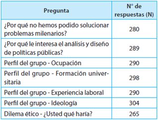 Las preguntas tienen relación con los temas tratados en las clases, en donde, por ejemplo, se indaga por los factores que los estudiantes identifican como necesarios para solucionar problemas milenarios, y por el interés de estos para formarse en análisis de políticas públicas. Asimismo, buscan identificar el perfil de los estudiantes-usuarios del libro en términos de ocupación laboral, disciplina de formación universitaria, tiempo de experiencia laboral e ideología política con la que se identifican. Finalmente, se pregunta a los estudiantes sobre qué harían frente al dilema ético planteado en la página 90 del libro, que se describirá posteriormente junto con los resultados de la pregunta.