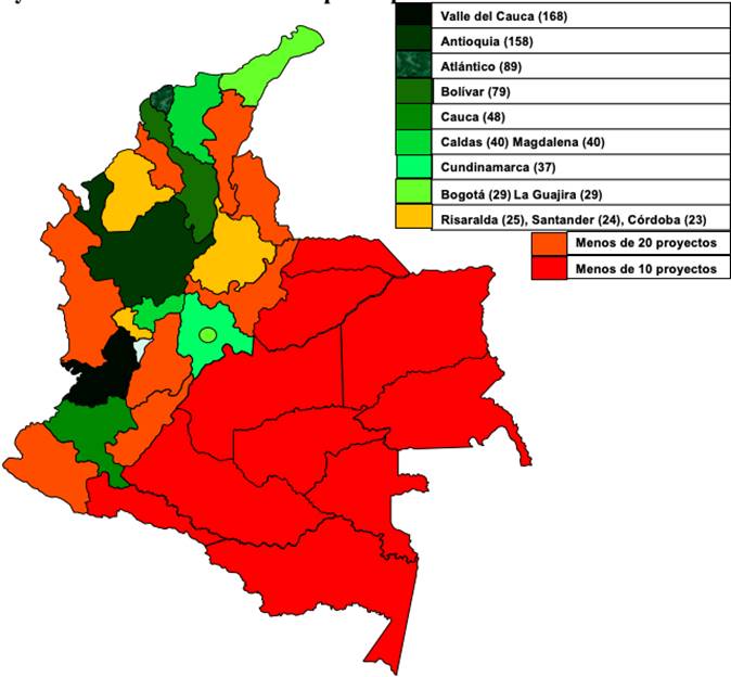 Por otro lado, en departamentos rezagados frente al cumplimiento de indicadores y metas sociales como Chocó, Sucre, Norte de Santander, Boyacá, Tolima, Huila y Quindío, las fundaciones AFE hacen presencia con menos de 20 proyectos. Peor aún sucede en el sur y el oriente del país en departamentos como Meta, Casanare, Arauca, Vichada, Guainía, Guaviare, Caquetá, Vaupés, Putumayo y Amazonas, en donde la presencia de los proyectos es más baja, pues cuentan con menos de diez proyectos por departamento, por las razones expuestas más adelante en las entrevistas.