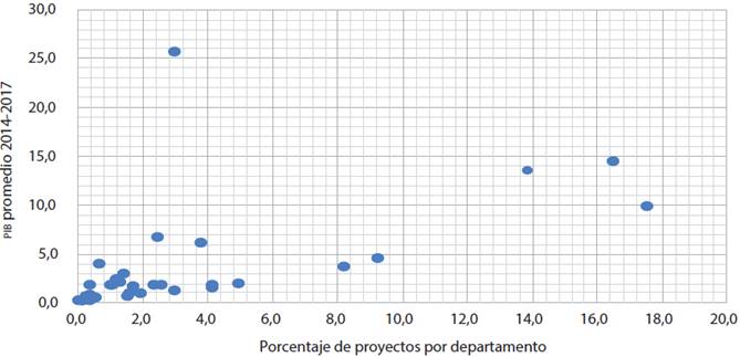 Para ahondar en la pertinencia territorial de la focalización de los proyectos de las fundaciones AFE, se indagó sobre el porcentaje de participación del PIB por departamentos entre 2014 y 2017 para cruzarlo con el número de proyectos ejecutados por las fundaciones en los mismos. El análisis evidenció que aquellos departamentos en los que los proyectos de las fundaciones AFE tienen mayor presencia, también cuentan con mayores porcentajes de participación en el PIB nacional, por ende, cuentan con un mayor grado de desarrollo productivo. Ejemplos de esto son Antioquia (PIB 14,5; 2017) y Valle del Cauca (PIB 9,8; 2017), que cuentan con más de 150 proyectos de las fundaciones AFE. En contraste, en donde se observa menor porcentaje del PIB y, por tanto, menor productividad y menores recursos para atender problemas sociales, hay menor presencia de los proyectos de las fundaciones AFE (figura 2).