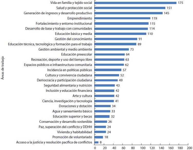 De este ejercicio se destacan los siguientes resultados: los cinco primeros temas con más proyectos ejecutados son: 1) vida en familia y tejido social (175 proyectos); 2) salud y protección social (151 proyectos); 3) generación de ingresos y desarrollo productivo (145 proyectos); 4) emprendimiento (119 proyectos), y 5) fortalecimiento y entorno institucional (175 proyectos). Lo anterior sin desconocer la importancia del tema educativo, dado que sumados estos cuatro temas: educación básica y media, educación técnica, tecnológica y formación para el trabajo, educación preescolar, y educación superior y becas son 295 proyectos los que apuntan a esta temática.