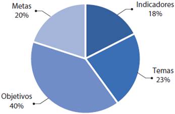 En contraste, los resultados de la encuesta diligenciada por 40 de las 72 fundaciones AFE evidencia un mayor aporte de las fundaciones AFE a nivel de objetivos (40 %) y temas (22,5 %), seguido de metas (20 %) e indicadores (17,5 %), lo que se podría asociar con la ausencia de una metodología eficiente de seguimiento y evaluación de sus aportes, aun cuando ellas mismas reportan el uso de herramientas de seguimiento, control y reporte de sus actividades y proyectos (figura 5).