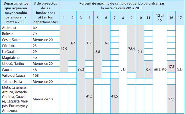 Como se observa en la tabla 1, los departamentos de Atlántico, Bolívar, Cesar, Sucre, Córdoba, La Guajira y Magdalena presentan mayores brechas para el logro de los ODS 1, 2, 3, 4, 5, 6, 9, 10 en 2030, aquí las fundaciones AFE aparecen con menos de 100 proyectos; para los departamentos de Chocó, Nariño y Cauca el reto está en los ODS 1, 3, 5, 9,10,11; para los departamentos de Meta, Casanare, Arauca, Vichada, Guainía, Guaviare, Caquetá, Vaupés, Putumayo y Amazonas, donde las fundaciones AFE hacen presencia con menos de 10 proyectos, el reto está en los ODS 3, 4, 7, 16. Con estos resultados se evidencia la incongruencia entre el número de proyectos de las fundaciones AFE por departamentos y las necesidades que marcan sus brechas -con la excepción de Valle del Cauca, donde las fundaciones AFE implementan 168 proyectos, focalización pertinente para que el departamento supere sus limitaciones en el logro de los ODS 3,5,10 y 11-. En este punto se considera deseable alinear las áreas de trabajo de las fundaciones AFE con los temas de los ODS rezagados en cada uno de los departamentos.