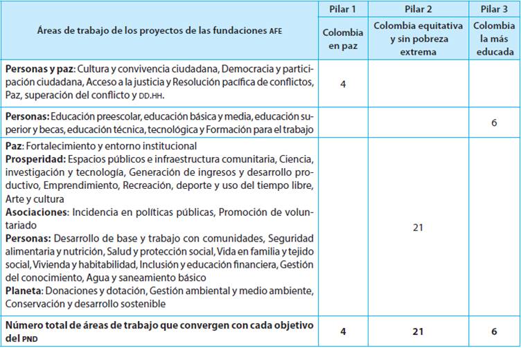 El PND 2014-2018, "Todos por un nuevo país", del gobierno del presidente Juan Manuel Santos, en la visión apuntaba hacia "una sociedad en paz que pueda focalizar sus esfuerzos en el cierre de brechas y que pueda invertir recursos en mejorar la cobertura y calidad de su sistema educativo, envuelto en una estrategia de crecimiento verde". Este Plan trabajó tres pilares: paz, equidad y educación; y seis objetivos: 1) competitividad e infraestructura estratégicas; 2) movilidad social; 3) transformación en el campo; 4) seguridad, justicia y democracia; 5) buen gobierno y 6) crecimiento verde (PND 2014- 2018). A continuación, en la tabla 2 se relacionan los tres pilares el PND 2014-2018 con la clasificación de las áreas de trabajo de la base de proyectos de las fundaciones AFE desde un análisis de correlación entre el texto y los planteamientos temáticos.