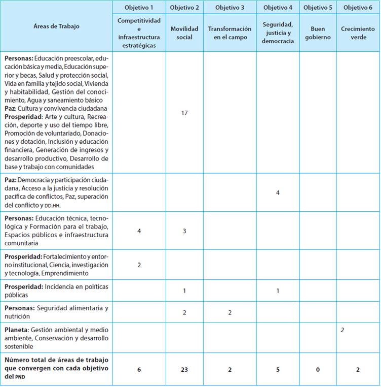 El PND 2014-2018 también cuenta con seis objetivos nacionales que se cruzaron con la clasificación de las áreas de trabajo de la base de proyectos de las fundaciones AFE desde un análisis de relacionamiento textual y cualitativo. En la tabla 3 se presentan los resultados.