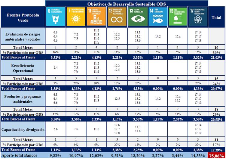 De acuerdo con la ponderación anterior se logró determinar que los bancos comerciales aportan un 75 % a los ODS a través del PV, contribuyendo a los ODS 7, 11, 12, 13 y 17, y que los frentes más representativos son: evaluación de riesgos ambientales, y productos y programas con beneficio ambiental.