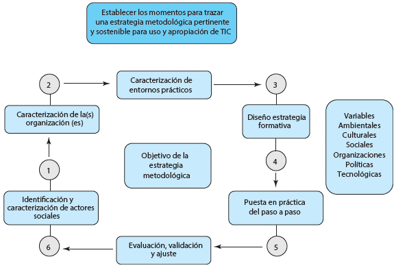 Como fruto del proceso analítico descrito se ha elaborado una propuesta de estrategia metodológica que se compone de seis momentos (figura 1). Cada momento cuenta con unos elementos prácticos que sirven de orientación para los actores sociales que la lleven a cabo. Es indispensable señalar que, dentro de la estrategia, la alfabetización digital es fundamental como punto de partida de acuerdo con el nivel de apropiación de TIC identificado. Para el ciclo de formación cada grupo debe tener un máximo de 12 personas, dado que es una cantidad adecuada desde lo pedagógico para establecer una estrecha relación entre el facilitador(a) y los participantes de la organización y, además, para clasificarlo por ciclos vitales. El facilitador(a) debe socializar el objetivo de la construcción colectiva de la estrategia metodológica con los consejos comunitarios afrocolombianos reconociendo las instancias clave para desarrollarla.