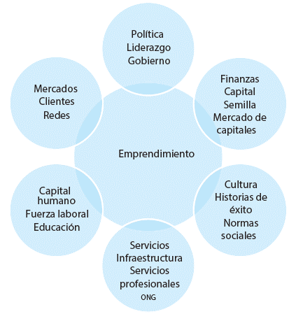 Isenberg (2010) expone que el buen funcionamiento de un ecosistema de emprendimiento depende de la comprensión y de mantener en equilibrio entre seis dominios: político, financiero, cultural, de servicios, capital humano y mercado. De esta manera, para ejemplificar lo anterior, las políticas tanto públicas como privadas, incentivos, institucionalidad, leyes y demás tópicos provenientes de la política, han de ser acordes y correlacionados con lo que se genere en los demás factores y viceversa, al entenderse, además, que un cambio en unos de los seis dominios afecta a los demás. En la figura 1 se exponen los dominios de un ecosistema de emprendimiento y los principales elementos a los cuales estos hacen referencia.
