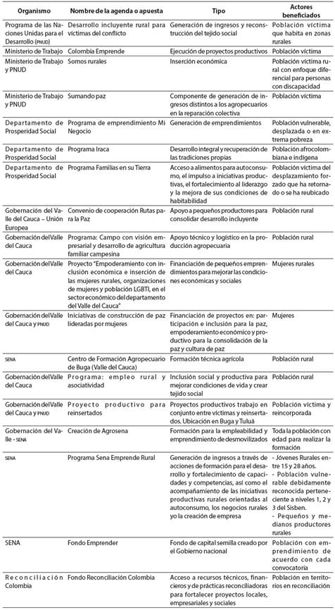 Al examinar las apuestas de construcción de paz en el Valle del Cauca se pudo evidenciar que existe articulación con programas e iniciativas orientados a ER y fortalecimiento del contexto rural para las poblaciones víctimas, en las que se destaca el enfoque diferenciador como es el caso de programas para mujeres, jóvenes, indígenas y comunidades afro. Para este caso, la articulación de los ER con las apuestas de construcción de paz se reduce a la existencia de los programas, sin embargo, las apuestas no están articuladas entre sí y, en algunos casos, no existe articulación entre las entidades que promueven estas apuestas, como es el caso de la Gobernación del departamento, el Ministerio de Trabajo, el Departamento de Prosperidad Social, el SENA, etc. En otros casos, como se presentó en latabla 2, sí se encuentran algunas articulaciones entre las entidades, por lo que se puede afirmar que coexiste una articulación y desarticulación entre los emprendimientos rurales y las apuestas de construcción de paz.