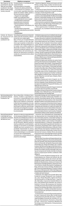 El Valle del Cauca agrupa un total de cuatro ecosistemas de emprendimiento, que involucran distintos tipos de organizaciones y realizan diversas iniciativas y proyectos, estos son: RRE del Valle del Cauca-ValleE, Sistema de Desarrollo Empresarial-Cali Emprendedora, REUNE y la Ruta de Emprendimiento del Valle. En latabla 2se presenta un resumen de estos ecosistemas.