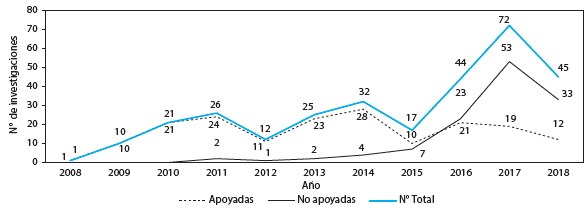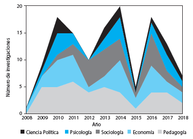 Como se puede observar, existe una cierta tendencia con pequeñas variaciones en el tiempo de la frecuencia de investigaciones en los campos de la ciencia política y la psicología. Las áreas de la sociología, la economía y la pedagogía, sin embargo, parecen ser muy sensibles a cambios en el tiempo, y parecen ser esporádicas en ciertos momentos, llegando incluso en algunos años a no recibir propuestas de investigación en estos campos de conocimiento.