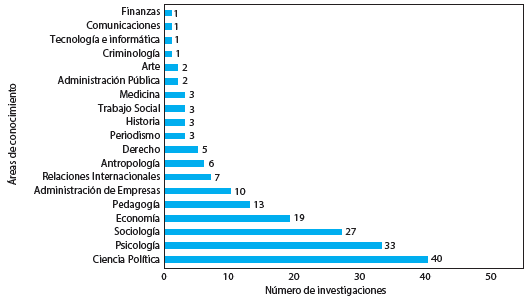 Al contar con la información de la base de datos de la ARN, queríamos saber si existía alguna tendencia sobre campos científicos particulares que pudiesen estar más interesados que otros en estudiar la reintegración, la reincorporación de excombatientes y la paz. Lo que se encontró es que áreas de conocimiento como la ciencia política, la psicología, la sociología, la economía y la pedagogía son los ámbitos científicos más afines con los procesos que ejecuta la ARN. Los resultados pueden verse en lafigura 2.