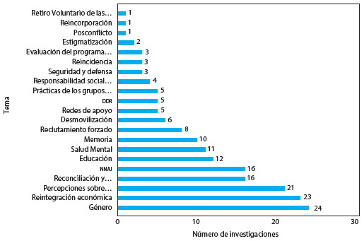 Las investigaciones desarrolladas entre 2009 y 2018, con el amparo de universidades extranjeras, han abordado con mayor frecuencia temas de género, NNAJ, reconciliación-convivencia y reintegración económica; el 59 % de estas han sido ejecutadas en Cundinamarca-Boyacá, seguidas por Antioquia, Norte de Santander, Tolima y Valle del Cauca. En lo que respecta al 61 % de las investigaciones amparadas por instituciones de educación superior colombianas, los temas destacados han sido género, percepciones sobre excombatientes y paz, reconciliación-convivencia y salud mental. De estas, el 91 % han sido desarrolladas por universidades privadas, destacándose la Pontificia Universidad Javeriana, Universidad de los Andes, Universidad del Rosario, Universidad Externado de Colombia y la Universidad del Norte. La participación de universidades públicas corresponde al 9 % del total, destacándose la Universidad Nacional de Colombia, la Universidad del Cauca y la Universidad Pedagógica Nacional.