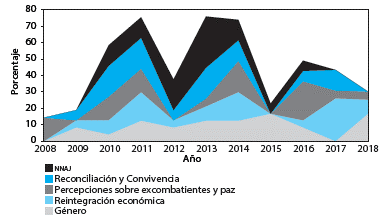 A lo largo del periodo de análisis se han abordado 22 temas, dentro de los que se destacan: género, reintegración económica, percepciones sobre excombatientes y paz, reconciliación-convivencia, y niños, niñas, adolescentes y jóvenes (NNAJ). Contrario a temas como DDR, estigmatización, posconflicto y reincorporación, como se muestra en lafigura 4.
