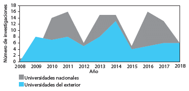 Como escenarios de construcción de conocimiento, las instituciones de estudios superiores juegan un rol fundamental en los procesos de reintegración, y ahora reincorporación de los excombatientes; sus aportes a través de la reflexión teórica y práctica desde diferentes disciplinas y contextos sociales permiten nutrir las políticas y los programas enfocados hacia la paz. En el caso de las investigaciones apoyadas por la ARN, el 61 % ha contado con el amparo de universidades nacionales, teniendo una participación significativa en los años 2011, 2013, 2014 y 2016. El 39 % restante corresponde a universidades extranjeras, que desde 2009 han sido constantes en el periodo de tiempo analizado, teniendo un alza significativa en el año 2014 (figura 6); de estas se destacan instituciones de países como Estados Unidos, Alemania, Inglaterra y Francia.