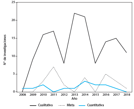 Como se observa en lafigura 8, las investigaciones cualitativas tienen cierta permanencia y vigencia en el tiempo. Esto mismo no ocurre con las investigaciones cuantitativas, las cuales son más sensibles a factores que desconocemos, y que hacen que en algunos años sea poca la producción científica en materia de reintegración o reincorporación bajo este tipo de estrategias de análisis.