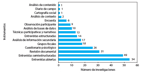Esto se corrobora con los hallazgos obtenidos al discriminar los instrumentos de recolección de información utilizados por los actores científicos. Como muestra lafigura 9, la tendencia a realizar investigaciones cualitativas se refleja en la frecuencia de uso de técnicas como las entrevistas (abiertas o estructuradas), los grupos focales o la revisión documental. Pocas han utilizado las bases de datos disponibles en la ARN.