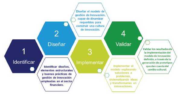 Con el propósito de lograr un proceso de transformación cultural para la innovación, se plantearon como metodología de trabajo cuatro pilares fundamentales presentados en lafigura 1, correspondientes a la identificación de modelos y elementos organizacionales clave, posteriormente el diseño de un modelo propio, seguido de una implementación y validación de la apropiación del modelo de gestión de innovación por parte de los colaboradores.