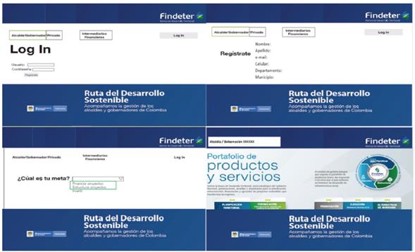 Con respecto a la plataforma de servicios transaccionales para optimizar la gestión de Findeter con sus clientes, se definieron cuatro objetivos centrales de la plataforma, que se desarrollará en diversas etapas: 1) información (prototipo de lafigura 7), 2) capacidad consultiva, 3) capacidad transaccional 4), capacidad de fidelización. Con esta solución se desea permitir un acercamiento a clientes (alcaldes y gobernadores), con una descripción de productos y servicios de manera personalizada, a través da usuario y contraseña, así como la posibilidad de consulta de productos o servicios actuales, transacción de productos y servicios, y servicios posventa (fidelización). Se realizó un lanzamiento en el evento denominado "Ruta del desarrollo". El escalamiento de este prototipo fue tomado por la Dirección de Tecnología con su correspondiente asignación de recursos.