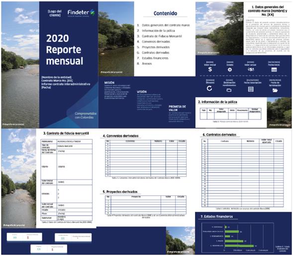 Por último, la solución correspondiente a la estandarización y automatización de informes para clientes inició como una versión borrador de los campos que se deben incluir en el informe, provenientes de las plataformas de seguimiento de proyectos y control fiduciario y, posteriormente, evolucionó a una versión de informe ejecutivo para la toma de decisiones de los clientes, con unas fichas resumen de los informes financieros. En lafigura 9se presenta un esquema del prototipo sin datos, considerando la confidencialidad asociada a los mismos y de algunos de los campos seleccionados.