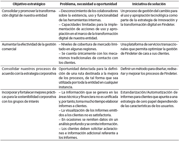 De acuerdo con el proceso establecido, se parte de un análisis de necesidades, problemas y oportunidades, para lo cual se toma como marco de referencia el mapa estratégico de la entidad y, con base en los objetivos estratégicos, se identifican las principales dificultades. Posteriormente, la alta dirección define acciones o iniciativas de solución en una matriz dequick winso victorias tempranas y, finalmente, se hace una revisión de las ideas a través de una prueba ácida, caracterizada por identificar que estas sean medibles, de bajo esfuerzo, con una generación de impacto a corto plazo y que logren el estado ideal, lo que favorece una priorización de las ideas que se van a prototipar.