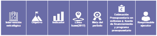 Esa línea procedimental, que debía dar como resultado lasintervenciones estratégicas,se distingue en el siguiente detalle programático: Sus componentes se definieron por MIDEPLAN (2018b, pp. 15-17) como sigue: