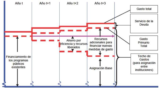 De manera gráfica, Martinere (2007, p. 15), apalancado a su vez en lo prescrito por el Fondo Monetario Internacional (FMI), traduce lo que procedimentalmente debería ser un marco plurianual, y la consiguiente proyección para la asignación de recursos (figura 3).