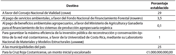En relación con los destinos legales, destacan los recursos correspondientes al Fodesaf provenientes del impuesto sobre las ventas, al Conavi y a las municipalidades relacionados con el impuesto a los combustibles, a las universidades estatales, juntas de educación y administrativas, Consejo Nacional de Desarrollo de la Comunidad, PANI y Banca para el Desarrollo provenientes del impuesto sobre la renta, entre otros. (Porras y Soto, 2018, p. 11)