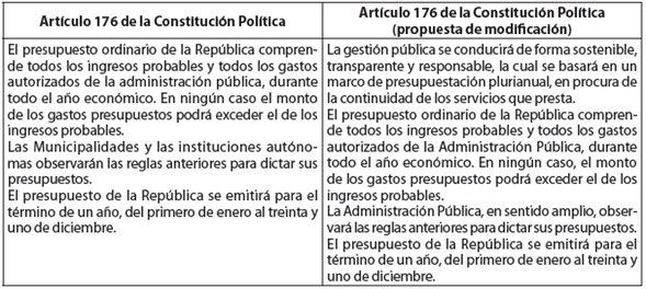 Más recientemente, Arroyo (2016) incluye a otras naciones con experiencia sobre la plurianualidad, como Bélgica, Francia, Marruecos, Israel, Japón y Colombia, al tiempo que resalta sus aportes para lograr la sostenibilidad del país, tales como: corrección de comportamientos fiscales, incremento de la flexibilidad en la asignación de recursos, incremento de la capacidad de control global y particular del gasto, mejora en el seguimiento y cumplimiento de programas y proyectos mayores a un año, una mejor orientación hacia resultados y un mayor incentivo al planteamiento estratégico de cada institución. Así, la autora se refiere al proyecto de ley presentado por la Contraloría General de la República, y que busca modificar el artículo 176 de la Constitución Política, tal como se muestra en la tabla 6.