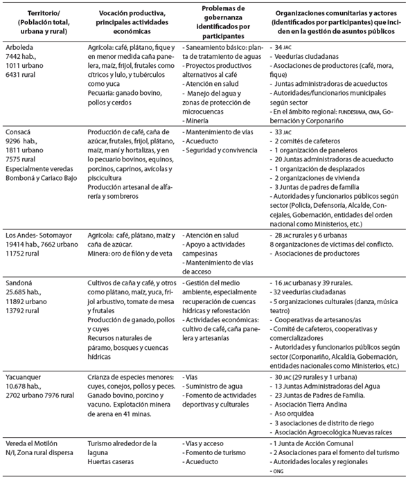 Las comunidades de los seis territorios participantes son fundamentalmente campesinas e indígenas, dedicadas en general a actividades agrícolas o de turismo. Los municipios escogidos en general cuentan con poblaciones que oscilan entre los 7000 y 25.000 habitantes, por lo que legalmente se identifican como municipios de categoría 6, es decir, pequeños en población y con escasos recursos financieros, tal como el 88 % de los 1101 municipios del país y como el 95 % de los 64 municipios de Nariño (DNP, 2016). El caso de la vereda El Motilón debe señalarse aparte por cuanto se encuentra dentro de la jurisdicción del municipio de Pasto, capital del departamento, aunque también se ubica en una zona rural, geográficamente separada del centro urbano, en inmediaciones de la laguna de La Cocha, humedal de importancia internacional ubicado en el Parque Natural Nacional Santuario de Flora y Fauna Isla de la Corota. La tabla 1 sintetiza los principales rasgos de los seis territorios y sus problemas de gobernanza, así como las organizaciones comunitarias y otros actores locales relacionados con la gestión de esos asuntos.