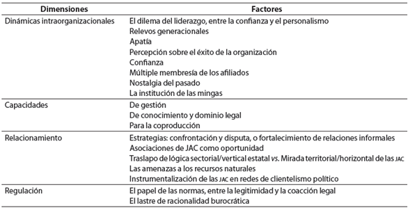 El análisis transversal de los factores que condicionan la potencialidad de las 57 organizaciones comunitarias representadas por los participantes de los seis territorios estudiados, se presenta alrededor de cuatro dimensiones, a saber: las dinámicas intraorganizacionales de las JAC, las capacidades de sus miembros, las dinámicas de relacionamiento con otros actores, y el papel de la regulación legal. La tabla 2 presenta una síntesis de los factores identificados agrupados en dichas dimensiones, y, posteriormente, se discuten aquellos factores que no solo tuvieron mayor prevalencia, sino que además fueron identificados como centrales por su influencia en las dinámicas organizativas y de relacionamiento de las JAC. Entre estos se destacan el dilema de los liderazgos que se debaten entre la confianza y el personalismo, el traslapo de la lógica sectorial gubernamental a la organización comunitaria, el lastre de la racionalidad burocrática estatal, el amplio desbalance que condiciona las relaciones entre autoridades gubernamentales y organizaciones comunitarias, y la oportunidad que representan tanto la institución tradicional de la minga como la agregación de intereses con otras organizaciones.