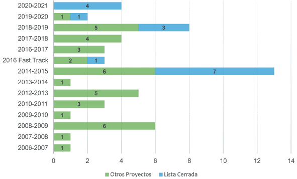 Tal y como se observa en la figura 1, a partir de 2006 (primer periodo del Legislativo elegido con las normas de la reforma política de 2003) ha habido 55 propuestas de reforma política, de las cuales 16 incluyeron la adopción exclusiva de listas cerradas y bloqueadas y la consecuente eliminación del voto preferente. Su participación no es mayor comparativamente con el total de proyectos identificados debido a que, al requerir reforma constitucional, el tema solo puede ser tramitado mediante acto legislativo. La figura 2 permite también observar cómo estas iniciativas normativas iniciaron su trámite después del año 2014, siendo precisamente el lapso 2014-2015 cuando se presenta el mayor número de proyectos.