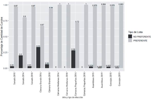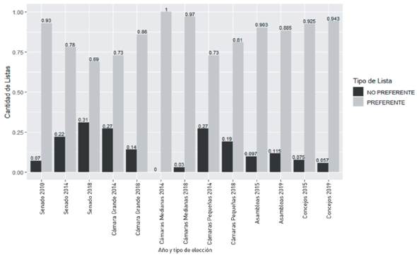 La tendencia observada resulta bastante clara: sin ninguna excepción predominan las listas con voto preferente en todas las elecciones, estas siempre representan más del 69 %, superando el 90 % en varias circunscripciones, e incluso alcanzando el 100 % de las listas inscritas en las circunscripciones de Cámara en 2014. Las listas cerradas solo son importantes a nivel nacional en las elecciones de 2014 y 2018, mientras que en el nivel subnacional el porcentaje no es muy relevante (cercano al 10 %). Para profundizar en estos últimos resultados, que parecen alejarse de la tendencia general, es pertinente responder a la segunda de las preguntas enunciadas previamente.