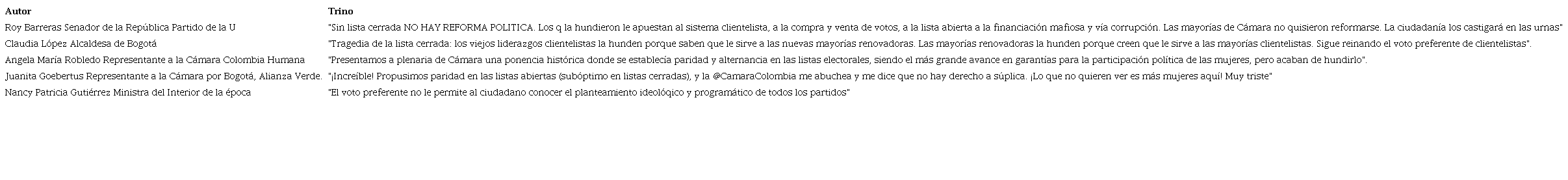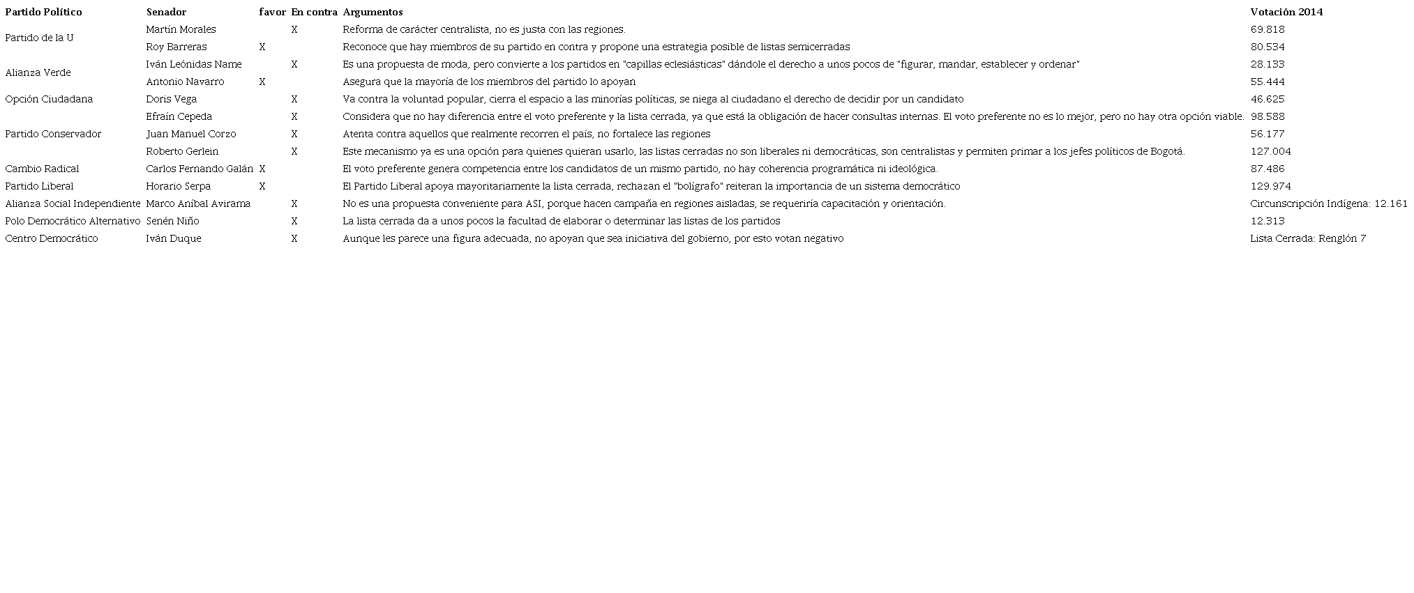- La mayoría de los parlamentarios y partidos que se pronunciaron en contra de la lista cerrada utilizaron el voto preferente para salir electos. Se destacan el Partido Conservador y el Partido de la U, con votaciones opuestas a la lista cerrada ampliamente mayoritarias entre sus senadores.