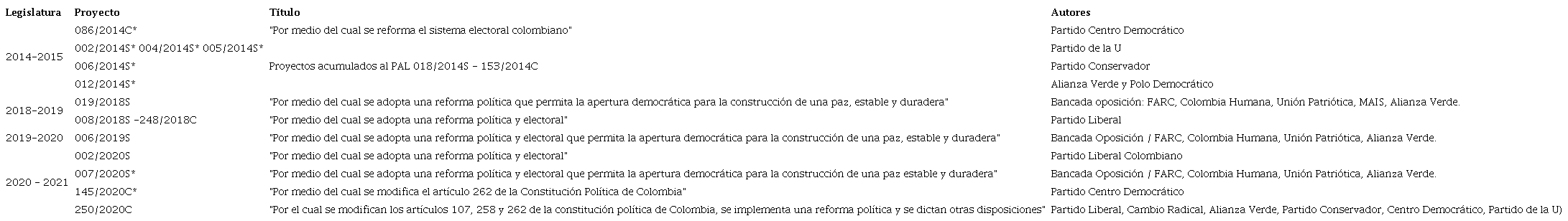 Interesa destacar los proyectos de iniciativa parlamentaria presentados en el último periodo (2020-2021) para mostrar, no solo la vigencia del tema en la agenda legislativa, sino los énfasis que se están dando al debate y el trámite cursado hasta su hundimiento definitivo. El Proyecto 007/2020-Senado, que proponía el uso exclusivo del voto preferente para las coaliciones de partidos políticos, fue acumulado con el proyecto 002/2020-Senado. Este último proponía la alternancia entre el voto preferente y la lista cerrada, lo que implicaba el uso de listas cerradas en 2022, voto preferente en 2026 y así sucesivamente de manera alternada; el proyecto fue archivado el 16 de diciembre de 2020. El proyecto 145/2020-Cá-mara, que tenía como único fin la eliminación del voto preferente, fue acumulado con el proyecto 250/2020-Cámara que proponía la posibilidad de permanencia del voto preferente hasta el año 2025 y la implementación de listas cerradas a partir de 2026 para todos los partidos políticos, finalmente archivado el 04 de noviembre de 2020. En general, estos proyectos contemplaron otras normativas requeridas para la adecuada implementación de las listas cerradas y bloqueadas (democracia interna, paridad, alternancia y universalidad, etc.).