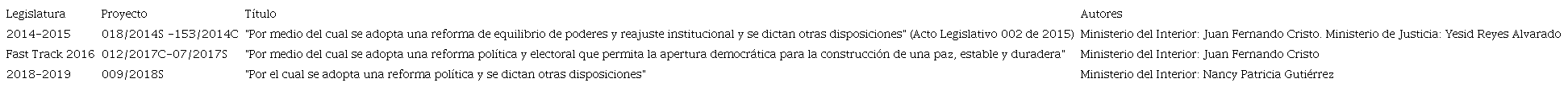 Por su parte, en los tres últimos periodos presidenciales, dos del expresidente Juan Manuel Santos (2010-2014, 2014-2018) y uno del presidente Iván Duque (2018-2022) se propusieron desde el Ejecutivo iniciativas tendentes a eliminar el voto preferente (tabla 3).